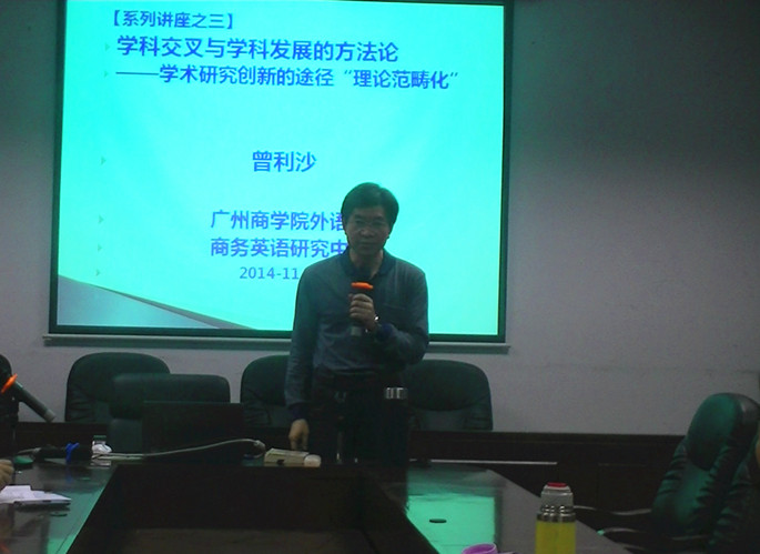 作为商务英语研究中心(筹)系列活动之一,11月20日下午,外语系商务英语学科带头人曾利沙教授于D308作了主题为“学科交叉与学科发展的方法论——学术研究创新的途径‘理论范畴化’”的讲座。外语系副主任袁鑫、商务英语教研室全体教师和外语系英语教师参加了此次讲座。