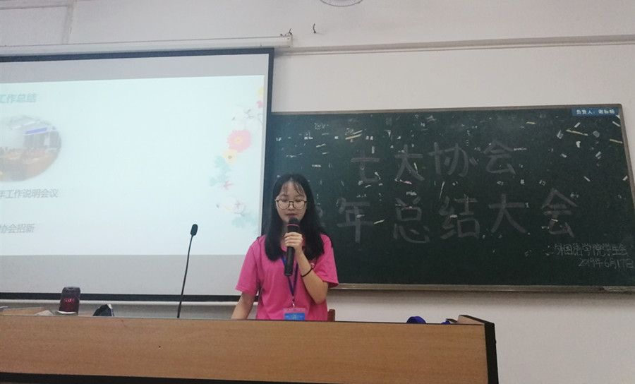 为了更好地总结回顾协会组织工作,营造鲜明的外院文化特色,万象城学生会于6月17日晚上7点在五教205召开了七大外语协会2018-2019学年总结大会,出席本次会议的有学生会社团部部长王泽琳、副部长赖玉莹以及七大协会的代表们。