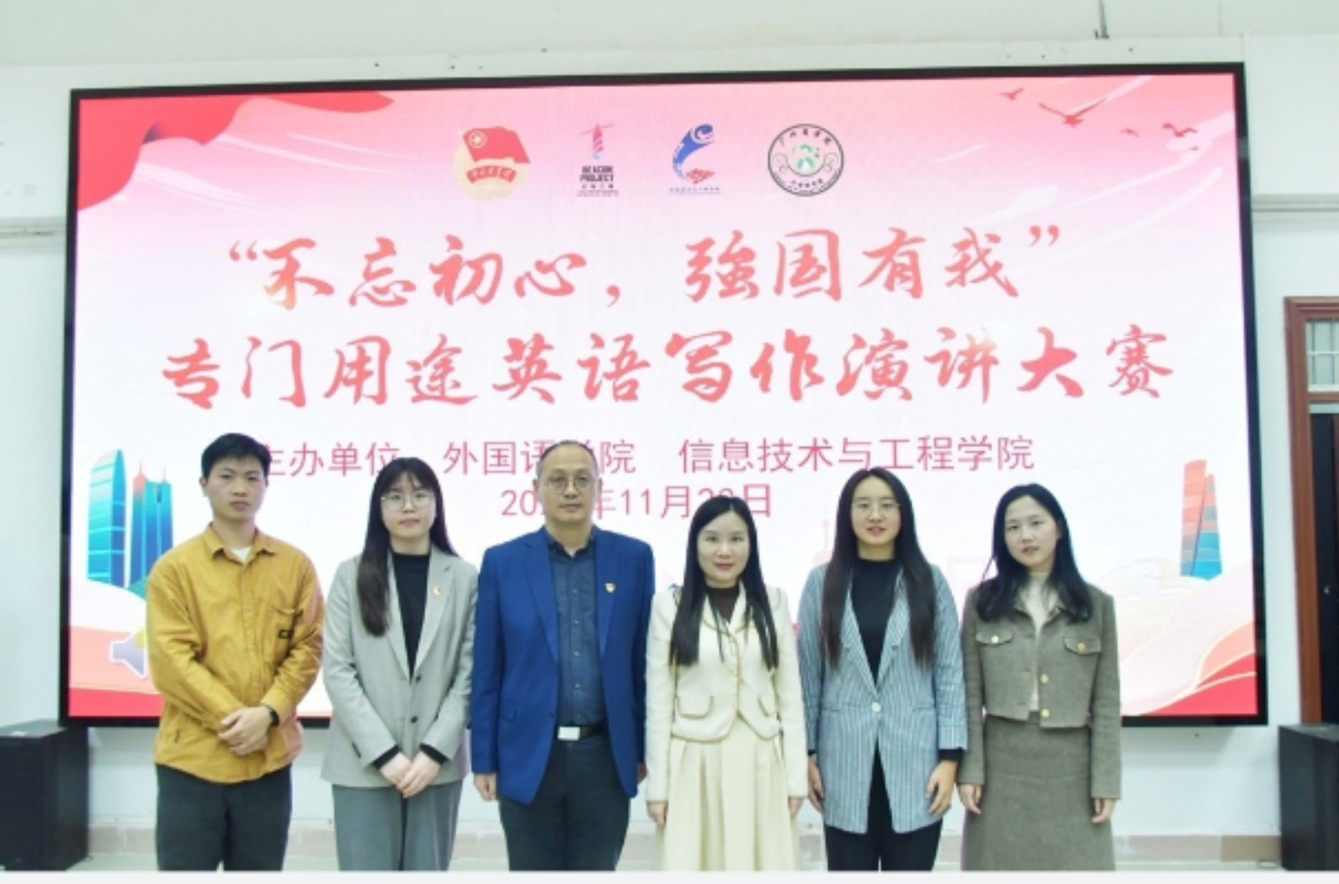 为提升二年级计算机相关专业学生用英语讲好中国故事的能力,11月23日晚,“不忘初心、强国有我”专门用途英语写作演讲大赛决赛在实训楼209教室举行。本赛事由awc77万象城官网主办,信息与技术工程学院、现代信息产业学院协办,整个赛程包括班级作文初赛、班级视频复赛、院级演讲决赛三轮。出席本次决赛的嘉宾为awc77万象城官网党总支书记徐超、信息与技术工程学院辅导员朱国华,比赛评委为awc77万象城官网大学英语二教研室姚丽芳老师、唐海民老师、董璐老师、向泽广老师、陈紫钰老师,参赛选手为2022级信息与工程学院、现代信息产业学院各班级晋级决赛的21名学生。