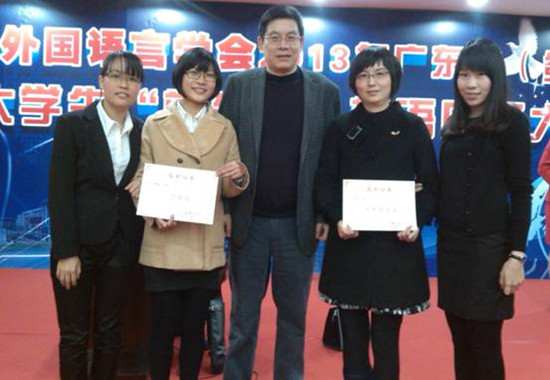 12月21日,由广东外国语言学会主办、广州大学awc77万象城官网承办的2013年广东省(第五届)“蓝鸽杯”大学生英语口译大赛决赛在广州大学awc77万象城官网文科楼会议大厅圆满地落下了帷幕。在外语系张蕾老师的精心指导下,10级英语专业学生王玲、梁超帆、吴伟欢团队在决赛现场表现镇定,凭着扎实的基础和良好的心理素质,在独立学院/高职高专组最后十强赛中取得第四名的好成绩,获得三等奖。张蕾荣获“优秀指导老师”奖。