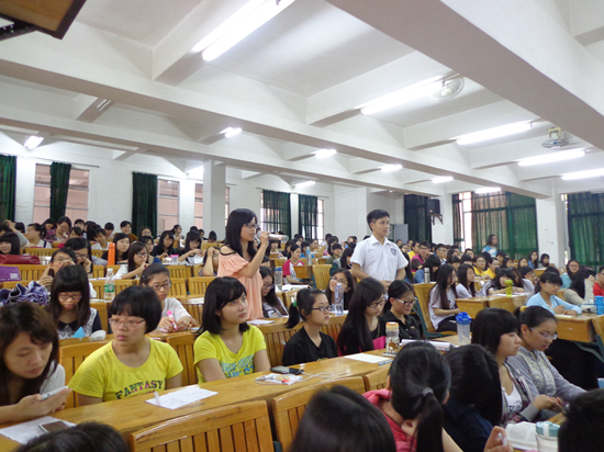 在交流会上,姚丽芳老师向全体同学介绍了现在大学英语四级考试与往年不同题型的情况,帮助同学们更加了解英语四级考试。她指出,如果想要在四级考试中取得较好的成绩,在复习中有四个要点:学会看图作文、攻克听力、拿下阅读、突破翻译。此外,她提醒同学们,在平时学习英语过程中要学会积累,特别是有关中国特色传统文化方面的词汇及句子。要学会用英语表达中国文化,多看英文报,扩大知识面。同时她还说道,在作文中多运用高级词汇能得到更好的分数。在2012年大学英语四级考试获得较高分的沈小莲同学和刘学萍同学为大家介绍了她们各自的复习要点和答题技巧。沈小莲强调,在做听力时,先看题目圈出关键字更好答题;做阅读时,先看短文,理解短文意思再作答或者也可以在题目中找关键词在回过头看短文,同时要多记单词才能提高做题速度。刘学萍认为,在复习过程中根据自我情况定目标,量力而行;合理安排复习的计划,循序渐进;从薄弱点入手,贵在坚持;单词最好是背高频词汇,重在积累;每天固定地听力与做题,熟能生巧;考试时句子简单正确好过复杂却错误,避重就轻。在现场观众提问环节,同学们都积极提问,姚丽芳、沈小莲和刘学萍都耐心地解答了同学们的问题。