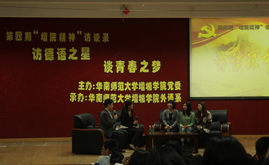 在播放完记录两位访谈对象一天学习、工作和生活的视频之后,本次访谈顺利拉开了序幕。外语系两位主持人请出了德语专业优秀学生的代表陈梓莹和陈莹同学。访谈过程中,国家奖学金获得者陈梓莹同学介绍了过去两年专业学习的经验,指出,“自幼爱好德语,兴趣是学习德语的最好的老师”;“在英语和德语同步学习过程中要有空杯心态”;同时要善于掌握词汇分类、词根相似规律等方法来记忆德语单词。华南地区高校第二届德语演讲比赛三等奖获得者陈莹与大家共同分享了参赛的经历,并强调“加强课余时间管理,坚持到图书馆学习,专业学习与校园文化活动是完全可以兼顾的”,此外她还介绍了联想法等德语学习方法。在经过一轮现场互动及视频展示之后,主持人请出了第三位访谈对象——陈勉纯同学。学院德语协会创办人、12级助理辅导员陈勉纯讲述了开创德语协会的过程与心得,“创办德语协会是为全院学生学习德语创造一个平台”“经费短缺是创办之初最大的困难,但挨家挨户去拉赞助则是对自身最大的锻炼”。在播放完一段12级学生专门制作给陈勉纯的视频之后,在场的全体师生肃然起敬,响起了一阵阵的掌声。陈勉纯表示,以生为本是做好学生干部的前提,在担任助理辅导员期间“深入学生公寓,逐个宿舍对新生进行德语颤音的辅导”,较好地完成了学长的职责。此外她还当场教授主持人学习颤音的方法,并分享了专业学习与担任学生干部两相促进的经验。