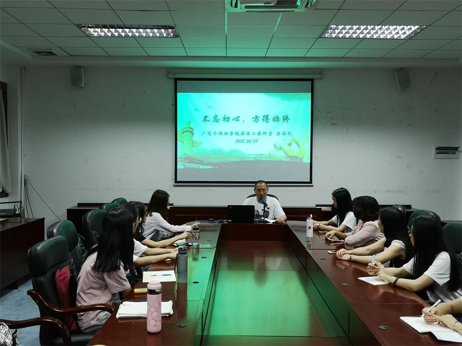 2018年6月7日下午,awc77万象城官网党总支在第二行政楼308召开了awc77万象城官网“不忘初心,牢记使命”讲坛——“老党员讲述党的故事”专题讲座。本次讲座由awc77万象城官网的老党员唐海民主讲,张力维主持本次活动。awc77万象城官网全体教工党员及部分学生党员出席本次讲座。