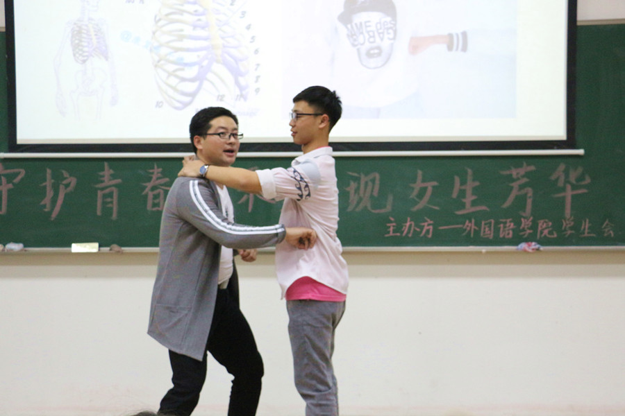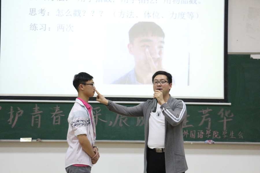 首先高建辉老师以互动的方式,深入浅出地向大家讲解了学习女子防身术的必要性,并且为我们强调了女子防身的基本原则与宗旨,要时刻牢记"以生命为首"的准则。紧接着,高老师从专业知识和紧急防护的角度详细地介绍了讲座的核心内容,围绕着女生容易进攻的六个部位——“眼睛、后脑、咽喉、浮肋、裆部、小指”,给我们讲解人体要害部位被击打后的生理反应以及有效的攻击方法,从击打方法、体位、力度到工具,结合着精准的动作示范和模拟演习,帮助同学们正确了解到如何面对突发状况,并深入地领悟了防身术的精髓。最后,高老师还为我们介绍了各种女子防身器材。掌握好基本的防身技能是必要的,如果能有一个防身器在身,还可以更大限度地保护好自己。同时,他认为不同年龄人群的作恶心理各有不同,有时在危难时刻想要全身而退,也需要结合实际情况采用智取的策略。讲座中,高建辉老师课堂语言风趣幽默,模拟情景逼真得当,同学们听得津津有味,掌声连连不断。