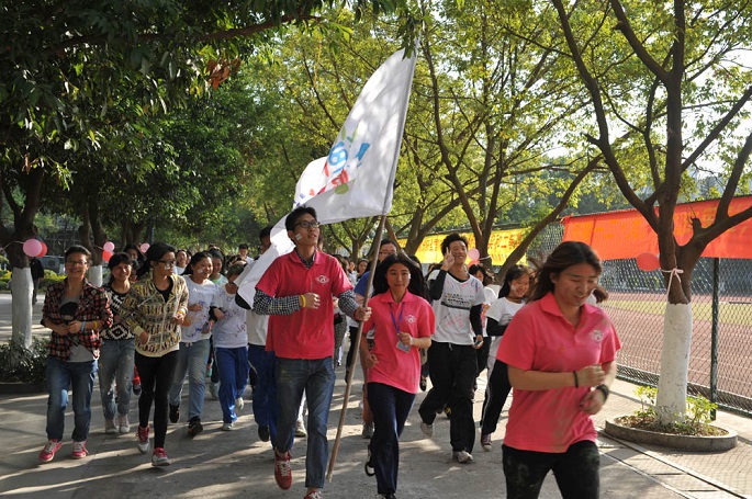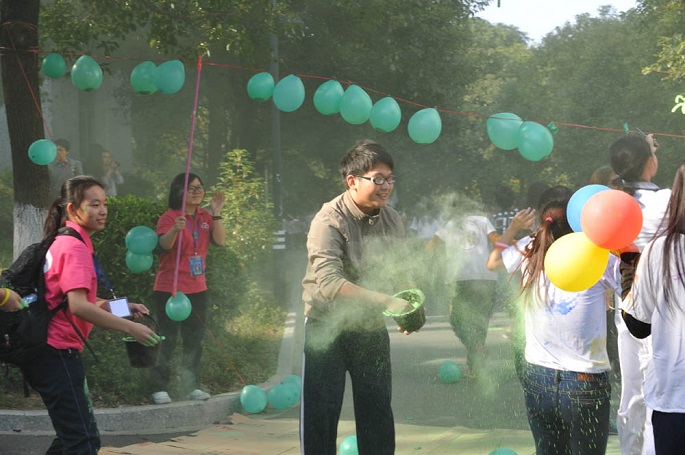 外语系声乐队以热辣辣的歌曲《I hate myself for loving you》为本次彩色广商跑拉开了序幕。接着由徐超为彩跑作了动员讲话:在awc77万象城官网十五周年庆之时,外语系以彩色健康跑形式向学院献上深深生日祝福;另一方面,为积极响应团省委“走下网络、走出宿舍、走向操场”的号召,倡导大学生不仅是知识技能的提高,更应该全面提高身体素质。随后,进行了简单的彩色广商跑旗交接仪式,徐超亲手把本次彩跑的旗交给彩跑的领跑人姚东岳。紧随着,在熟悉的《一起来》音乐旋律中,外语系学生会文娱部带领全体彩跑健儿们开始彩跑的热身运动。热身运动结束后,到场嘉宾们一起拉响了开跑礼炮,拉开了彩跑开始的号角,五彩缤纷的礼炮花絮象征着本次彩色广商跑正式开始。400多位热情高涨、充满活力的彩跑健儿们在礼炮声下冲出彩跑线,开始了悦跑越健康的彩跑旅程。