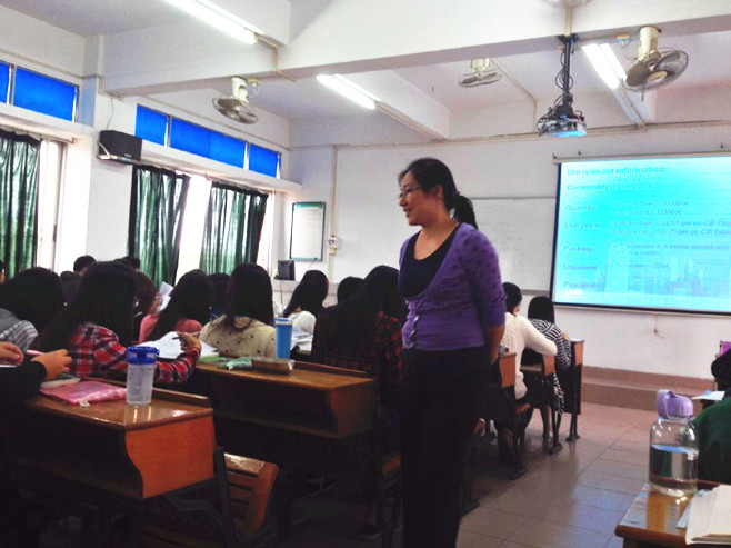 李燕老师以任务型教学为主线,通过让学生模拟填写售货合同,运用多媒体课件等多种手段创设了生动有趣的情景,凭借丰富的教学经验,风趣幽默的语言,由浅入深的引导;形成师生互动的效应,课堂气氛轻松愉快。在师生有效互动的过程中,使学生把所观察到的事物运用准确的语言表达出来,学生在不知不觉完成了售货合同。全体听课教师都十分投入。可以说这节课上得“简单、高效”。此外,李老师还批改学生所做的课堂笔记,在课堂上展示学生的优秀笔记,这一环节很大程度上强化了商务英语专业学生的记忆。