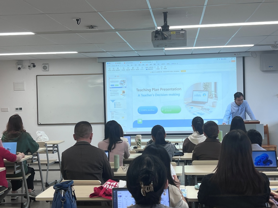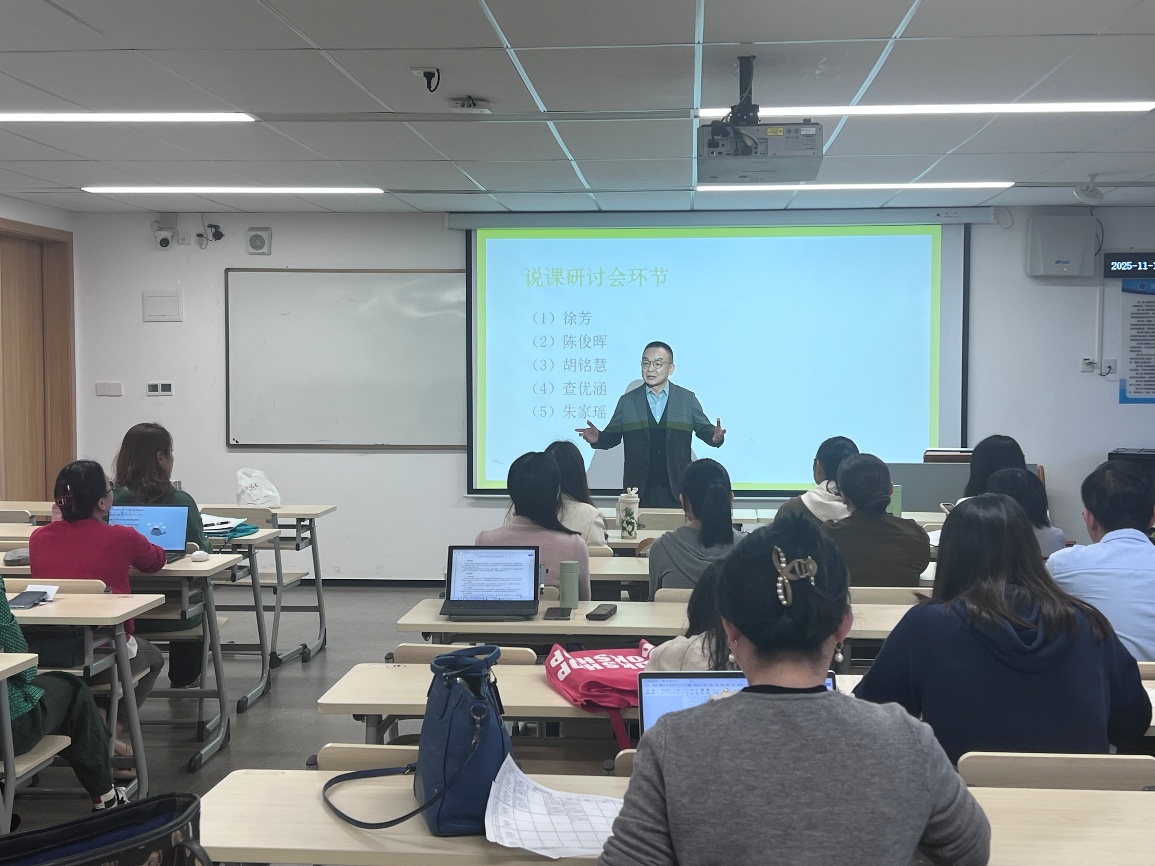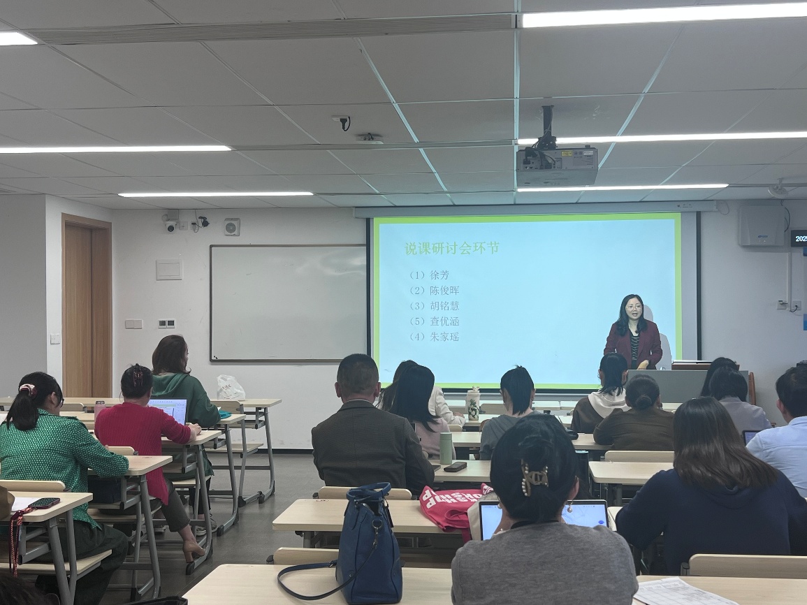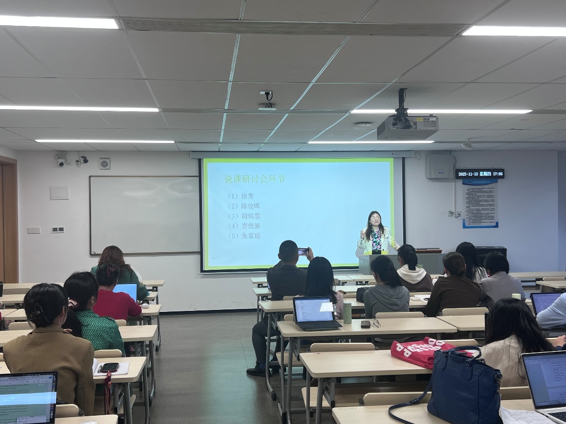 随后的说课研讨环节,徐芳、陈俊晖、胡铭慧、查优涵、朱家瑶五位教师依次进行说课展示。徐芳老师聚焦课程重难点突破策略;陈俊晖老师分享生成式人工智能工具的创新应用;胡铭慧老师重点突出学生主体地位,通过融入学生成果展示环节,既反馈了教学成果,也为后续教学优化提供了实践依据;查优涵老师探讨课程思政与专业教学的融合路径;朱家瑶老师重点阐述了课堂活动的设计理念。说课结束后教师们围绕相关维度展开研讨,碰撞出诸多教学改进新思路。