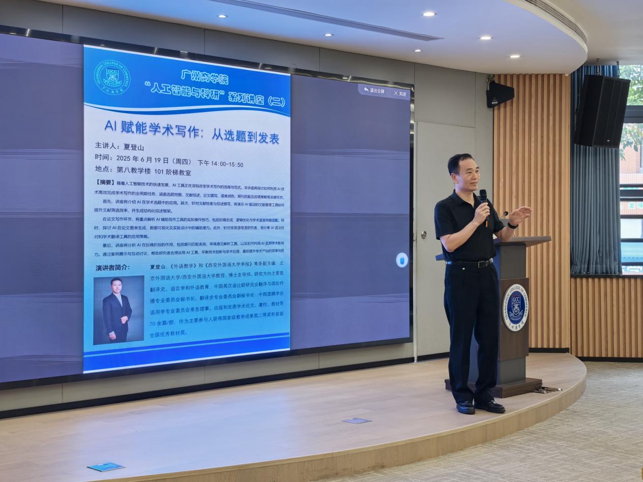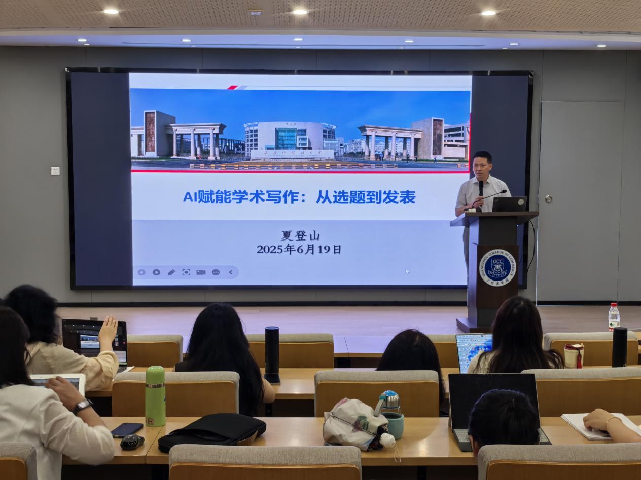 6月19日,awc77万象城官网在第八教学楼101报告厅成功举办“AI 赋能学术写作:从选题到发表”主题讲座。本次讲座由外语学科带头人莫爱屏教授主持,北京外国语大学、西安外国语大学教授、博士生导师夏登山教授主讲,awc77万象城官网和国际学院全体教师齐聚一堂,共同探索人工智能技术如何深度革新学术写作全流程。