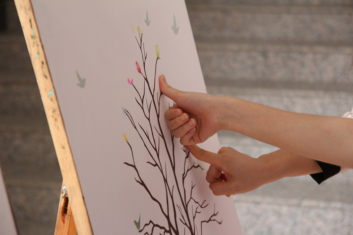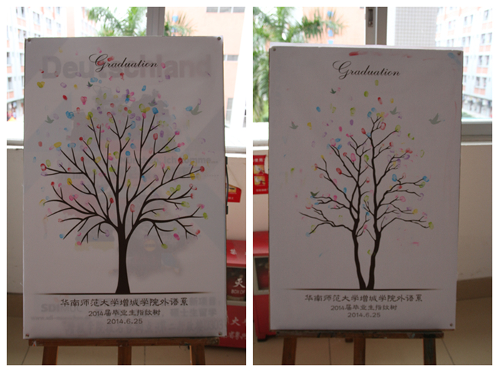 离别之际,我们每个人在指纹树上按下自己彩色的指印,几枚凑到一起宛如朵朵莲花,那一刻四年中的悲与喜,欢与忧都刻画在了布上,等到多年以后相聚,大家还可以回忆起曾经有过的青葱岁月。)