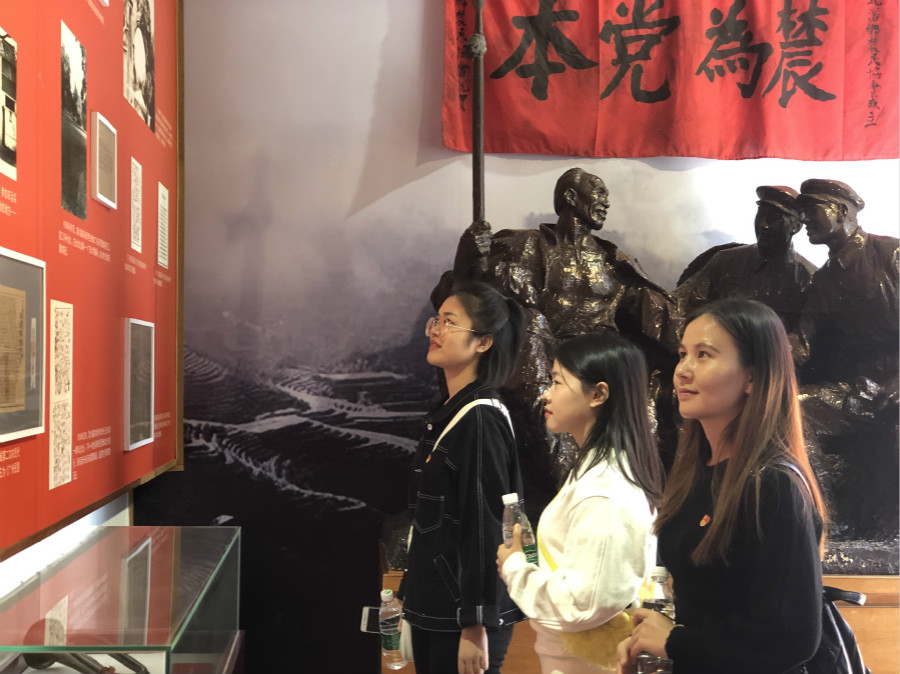 全体学生党员准时抵达农民运动讲习所旧址纪念馆。从旧址建筑观赏开始参观之旅,一方面,学生党员分别经过旧址教务部、庶务部和值星室、图书室、所长办公室、课堂和军事训练部和教员及学员宿舍。古迹的建筑、陈旧的展览品和详细的文字说明为学生党员参观学习提供了直观的学习资源;另一方面,随着讲解员深情并茂的解说,先烈的故事和革命的事迹、无一不展示着共产党人坚定不移的革命信仰和砥砺前行的磅礴气势,让党员们深刻感悟到了共产党人的初心和使命,纯洁和坚定。参观结束后,在黄玉亭带领下全体党员面向党旗,重温入党誓词,庄严的宣誓下,声音响亮,铮铮誓言,坚定不移,胸前党徽光芒的愈发耀眼。参观过后,党员以党小组为单位,在农讲所旧址里开展了学习研讨活动,谈心得体会、学党的十九届四中全会精神。途中,还开展了一节特殊意思的党课。主讲人是同样来农讲所参观学习的老党员同志,学生党员集中围站学习,听老党员讲革命的故事、讲祖国成就。讲人生阅历。学习交流氛围积极热烈。