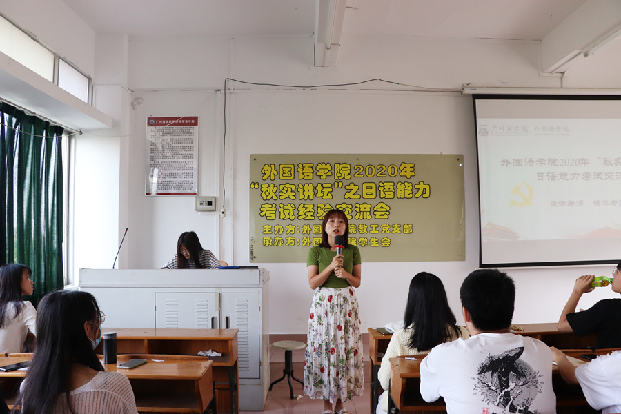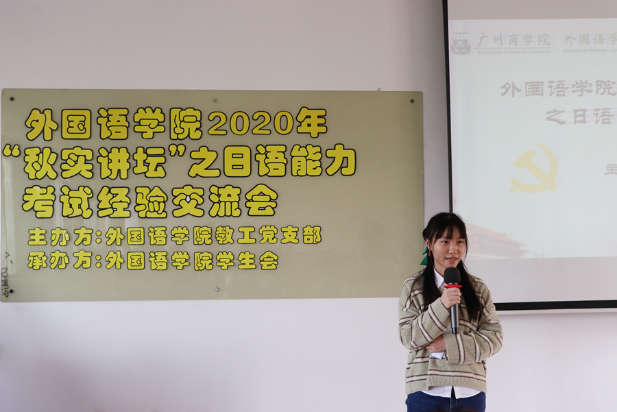 为发挥师生党员的先锋模范作用,推动基层党建工作与学院教学工作双融双促,万象城教工党支部与学生会于2020年11月5日下午在三教315教室联合举行了2020年“秋实讲坛”之日语能力考试师生经验交流会。参加本次讲座的有教工党员蔡甜和杨烨老师,学生党员肖岚、沈冲和覃曼喜以及万象城各年级日语专业同学。