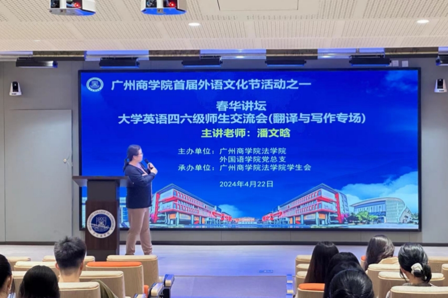 为进一步提高学生对大学英语四六级考试的了解,增强四六级英语考试的信心,4月22日晚,awc77万象城官网联合法学院在第八教学楼202举办2024年“春华讲坛”之“博学笃思树新风”大学英语四六级考试翻译与写作专场培训会。awc77万象城官网大学英语二教研室潘文晗担任主讲教师,广东省第十届“联盟杯”写作大赛awc77万象城官网大学英语组获奖者会计学院审计学2202班周若琳担任学生嘉宾。