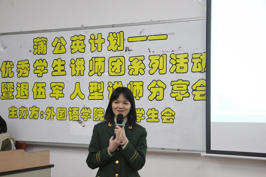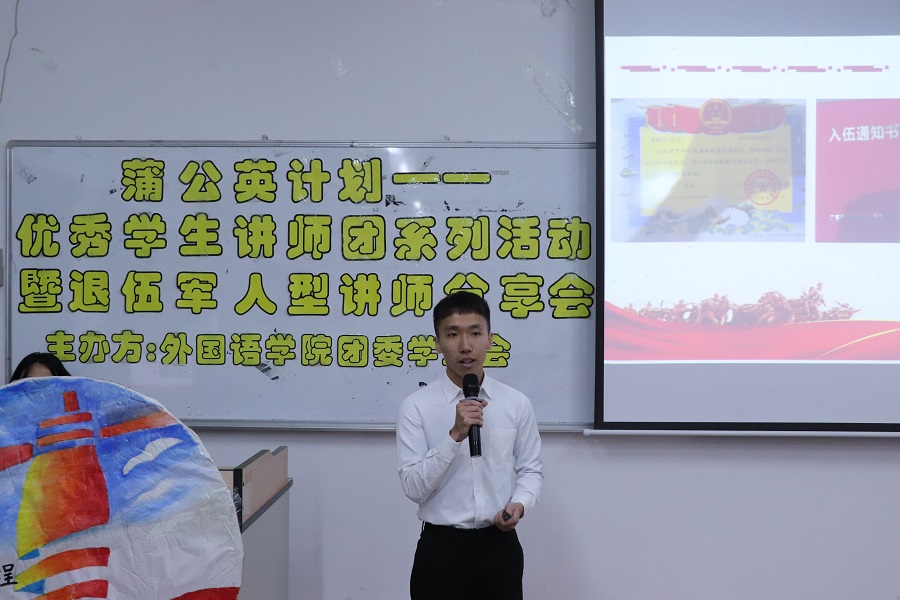 铮铮铁骨战沙场,气宇轩昂斗志扬。为弘扬军人的优秀精神,增强awc77万象城官网学子的责任感和使命感,awc77万象城官网团委学生会于12月17日19:00在三教105开展awc77万象城官网蒲公英计划——优秀学生讲师团系列活动暨退伍军人型讲师分享会。出席本次分享会的嘉宾有awc77万象城官网党总支徐超书记、awc77万象城官网18级辅导员李嘉欣、19级辅导员谢清玲以及20级辅导员蔡文蝶。