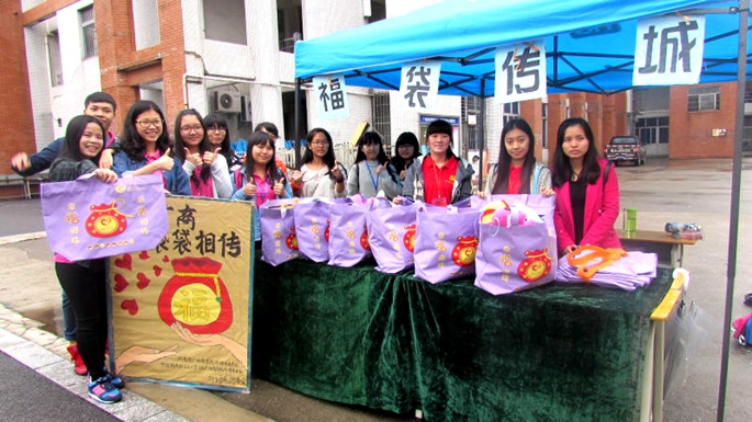 为传递爱心公益,外语系团委与中国特色社会主义学习会外语系分会于2016年3月22日至24日在广商舞蹈室旁举行了“幸福广商,袋袋相传”福袋传城活动。