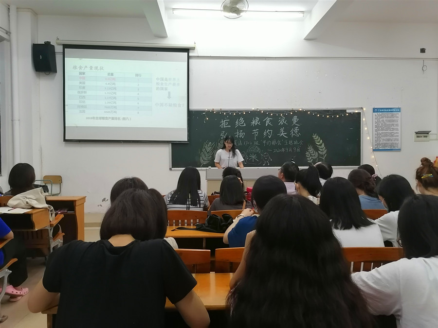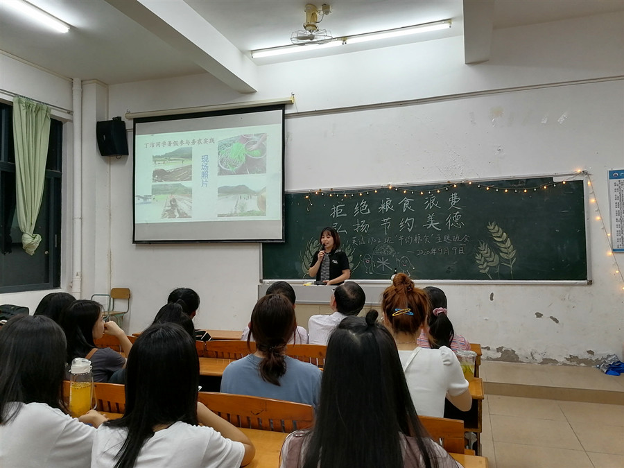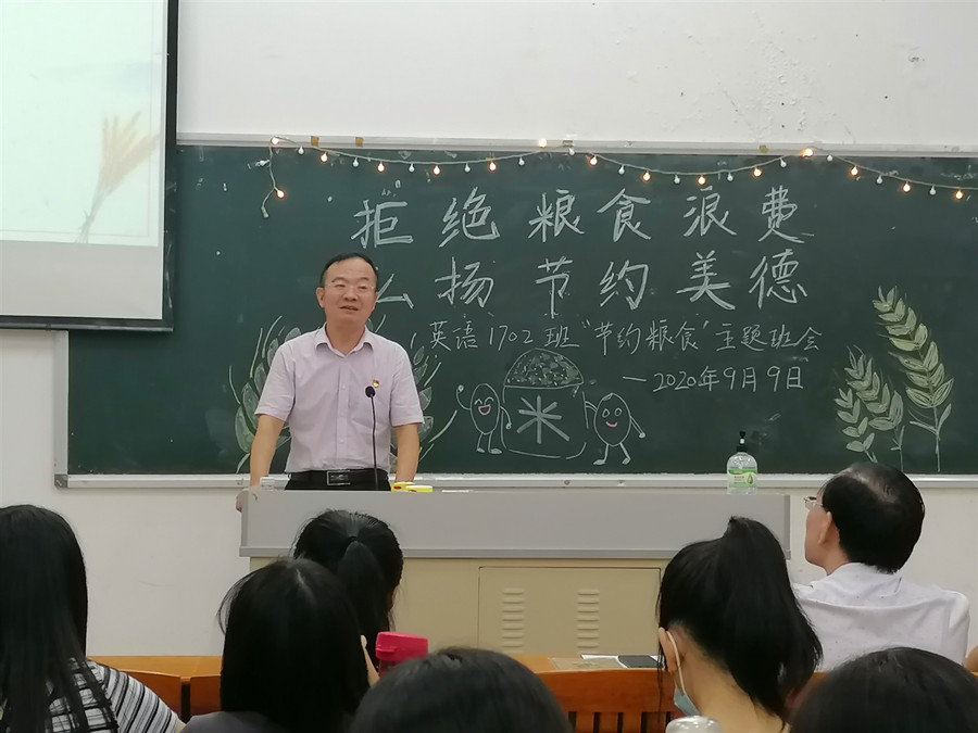 为响应党中央关于制止餐饮浪费行为的重要指示精神,大力弘扬中华民族勤俭节约的传统美德,加强班级学生爱粮节粮的忧患意识,万象城17级英语专业2班于9月9日晚在四教110开展了以“拒绝粮食浪费,弘扬节约美德”为主题的班会活动。班级结对子老师黄弢校长、学院党总支书记徐超、班主任石佳、17级辅导员刘丽出席现场,班会由班长林晓莉主持。