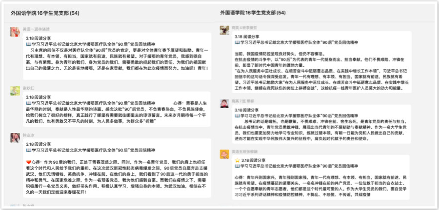 此外,为了营造支部线上学习氛围,各位党员同志还通过支部阅读日打卡活动,在党支部微信圈里纷纷分享了学习习近平总书记重要回信精神的心得体会。
