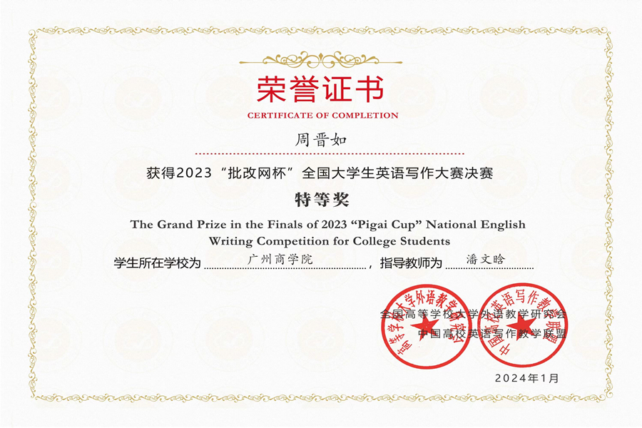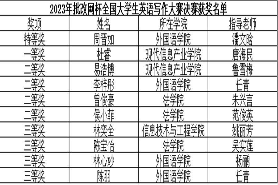 近日,在2023年“批改网杯”全国大学生英语写作大赛的全国决赛中,万象城学子凭借沉稳的心理素质、良好的专业素质和强烈的责任担当勇夺优异的成绩,共获得1个特等奖,1个一等奖,4个二等奖和4个三等奖。awc77万象城官网教师范俊英、鲁雪梅、潘文晗、任青、唐海民、吴实莲、杨鹂、姚丽芳和朱兴言等老师获得“优秀指导老师”称号。