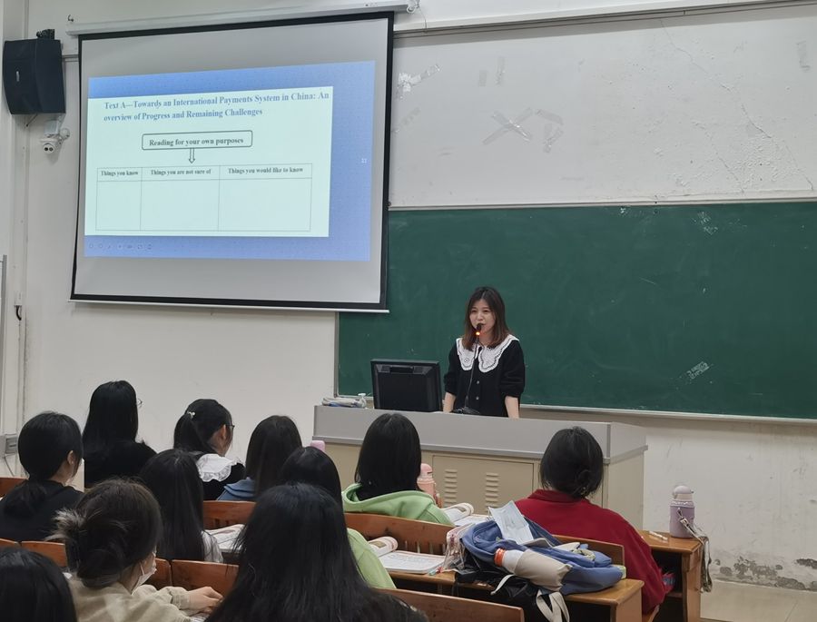 本次研讨课是2021级商务英语专业肖涛婷老师主讲的“商务英语阅读II”课程,主讲内容为“Payment”。肖老师先用知识图式回顾了上节课的知识点,接着介绍中国货币发展时间线和重要阶段,以此为切入点引出国际货币支付系统的内容。接下来,把课文阅读分解为两个“任务”。第一个任务,通过阅读文章中的段落,利用标题预测课文主要内容和知识点,并通过小组讨论的方式,让学生深入了解各种支付和结算手段的区别以及英语的表达方式。第二个任务分析研究论文的文章结构进行,并以此对文章要点进行解读。肖老师全程用英语进行讲授,教态自然,语速平稳,课程设计完整流畅,教学环节紧凑,教学内容丰富,教学效果良好。