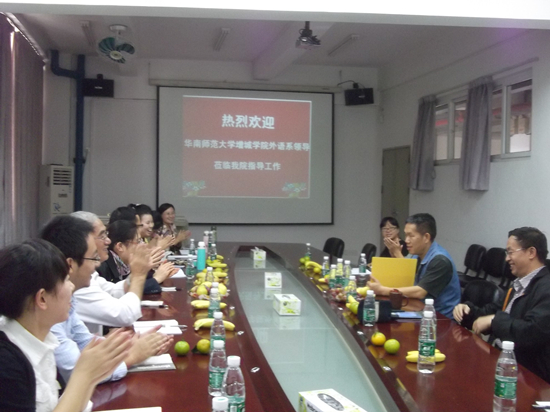 为顺利开展大学英语教学改革,对2012级学生的大学英语采取分层教学的方式,提高教学质量,11月15日下午在学院教学处和我系的安排下,学院教学处副处长、评建办主任左灵芝、外语系主任胡光忠、外语系副主任袁鑫、教学处部分教师、大学英语教研室主任以及2012级大学英语全体教师共同到华南农业大学参观国家级大学英语教学示范基地,向兄弟院校学习大学英语的教学改革经验。交流会由华南农业大学awc77万象城官网院长何高大教授主持。
