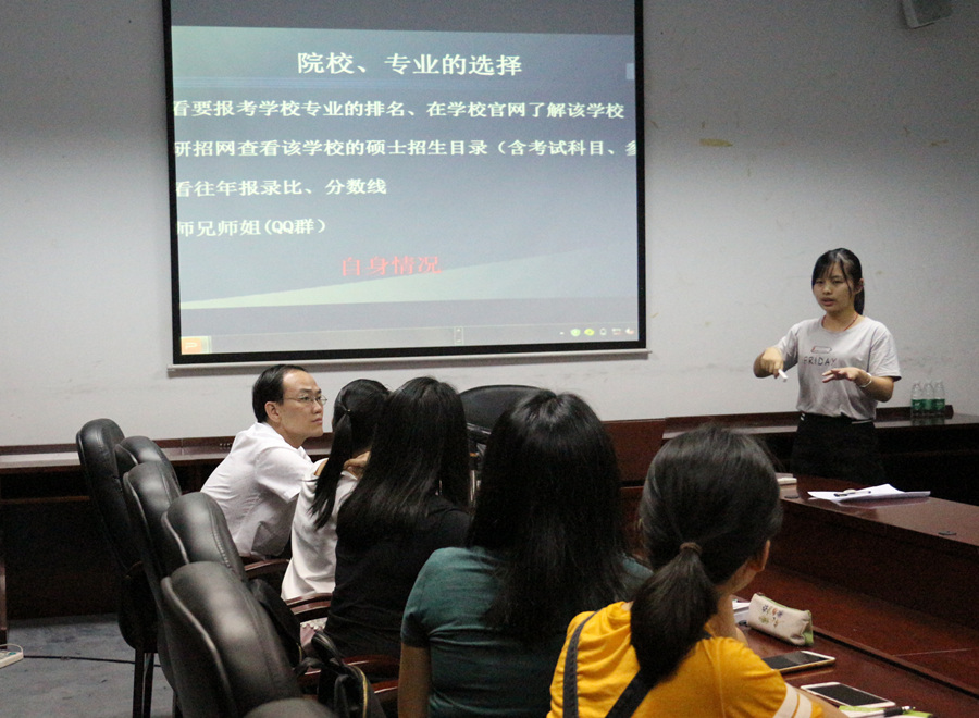 为了延续良好的考研风,万象城在今年三月举行了“SFL生涯辅导工作坊”的2018届毕业生考研动员活动,在5月5日下午在第二行政楼308召开考研专题的第二场:考研经验交流会。学院党总支书记徐超、13级辅导员雷肖茹、14级辅导员刘万里、14级意向考研学生共30余人出席了交流会;本次交流会由3位优秀考研代表讲授考研经验及心得,分别是成功考入华南师范大学的吴佩珍,江西师范大学的杨梦环和广州大学的阮泳仪。