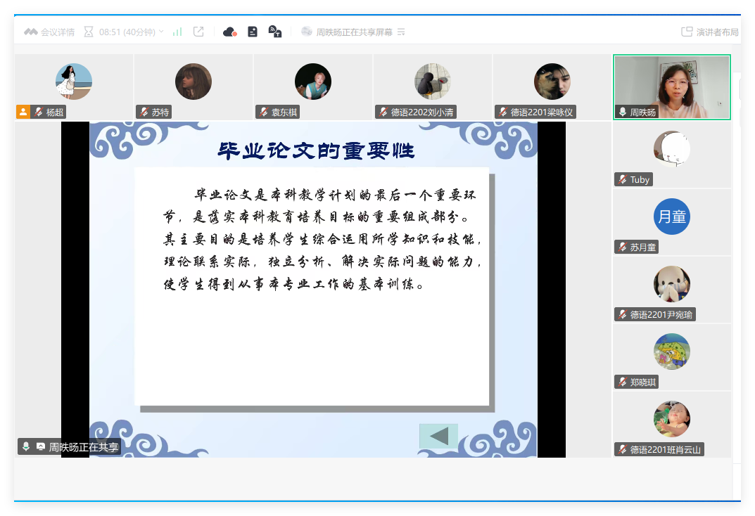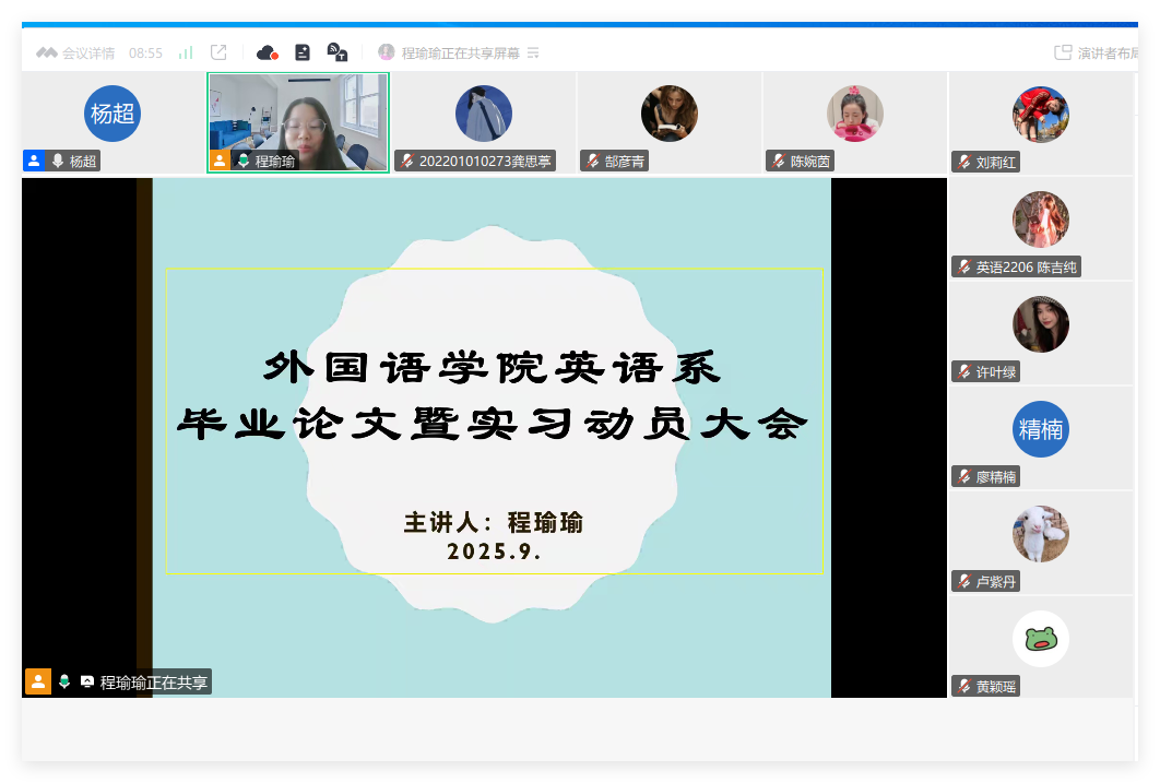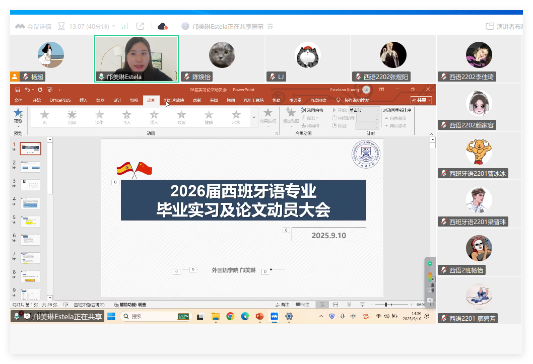 为进一步做好2026届毕业论文与毕业实习的组织和指导工作,兼顾校外实习学生的实际需要,9月9日至10日,awc77万象城官网面向英语、商务英语、日语、西班牙语和德语五个专业,成功举办五场线上毕业论文与实习动员大会。系列会议依托腾讯会议线上平台开展,实现师生广泛参与和高效互动,充分彰显了学院教学管理在数字化转型中的创新实践。大会由awc77万象城官网院长助理张雅敏统筹,英语专业系主任程瑜瑜、商务英语系主任李望华、日语专业系主任杨烨、西班牙语专业系主任邝美琳、德语专业系主任周昳旸以及教务员杨超参加会议,各会议专场由各系主任主持。
