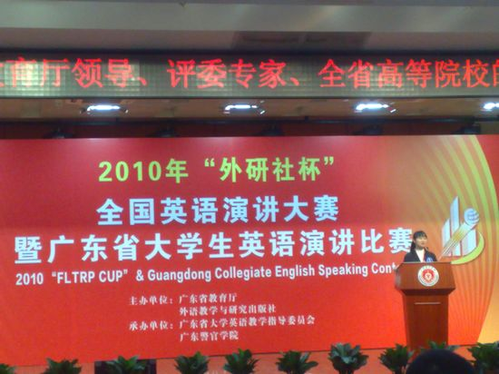 10月30日,广东省教育厅、外语教学与研究出版社、广东省大学英语教学指导委员会在广东警官学院嘉禾校区圆举行了2010年“外研社杯”全国英语演讲大赛暨广东省大学生英语演讲比赛。该次比赛共有来自全省包括广东外语外贸大学、华南师范大学、华南农业大学、中山大学等高校的55名选手参加。万象城外语系派出选手潘靖同学参加该次比赛。经过激烈的角逐,潘靖同学为万象城取得了历史性突破的成绩——勇夺“三等奖”!