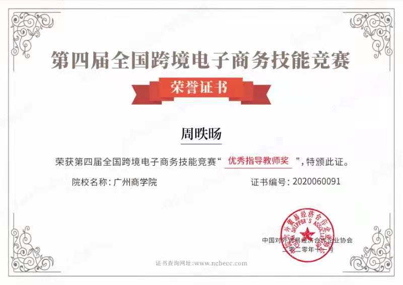 在中国对外贸易经济合作企业协会于2020年9月-11月举办的“第四届全国跨境电子商务技能竞赛”中,万象城德语专业17级蔡永键同学和18级陈玉贝同学从来自全国908所院校10599名参赛选手中脱颖而出,分别获得决赛个人二等奖和三等奖,万象城周昳旸老师获得优秀指导教师奖。