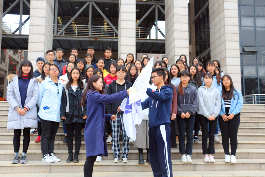 乘着幸运之风,万象城阳光展翅服务团将在寒假再度起航,举行主题为“返璞归真,传承中华,志愿践行十九大”2018年寒假传统文化志愿服务活动,并于1月5日中午在第四教学楼前举行了出征授旗仪式,出席仪式的除了学院团委干部,还有16级和17级的部分学生代表。