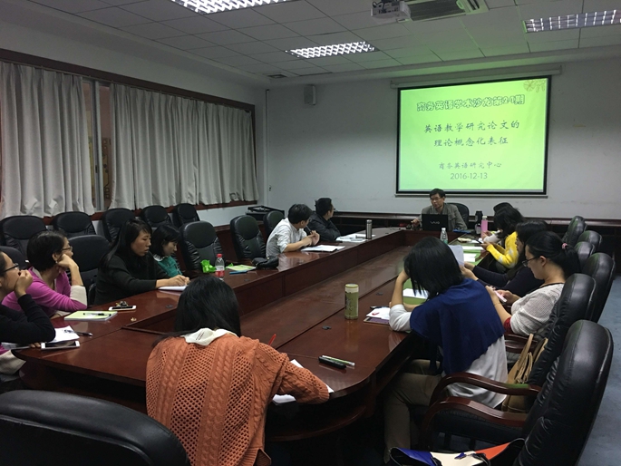 讲座一开始,曾教授对商务英语系伍彩芬老师在万象城“第3届中青年教师教学大赛”中获得第一名的好成绩予以充分的肯定,请伍彩芬老师用简短的语言对自己课程设计的思想进行总结,由此引入了今天沙龙的主题——英语教学研究论文的理论概念化表征,指导教师们如何把教学实践的经验上升为概念,形成自己的教学理论。