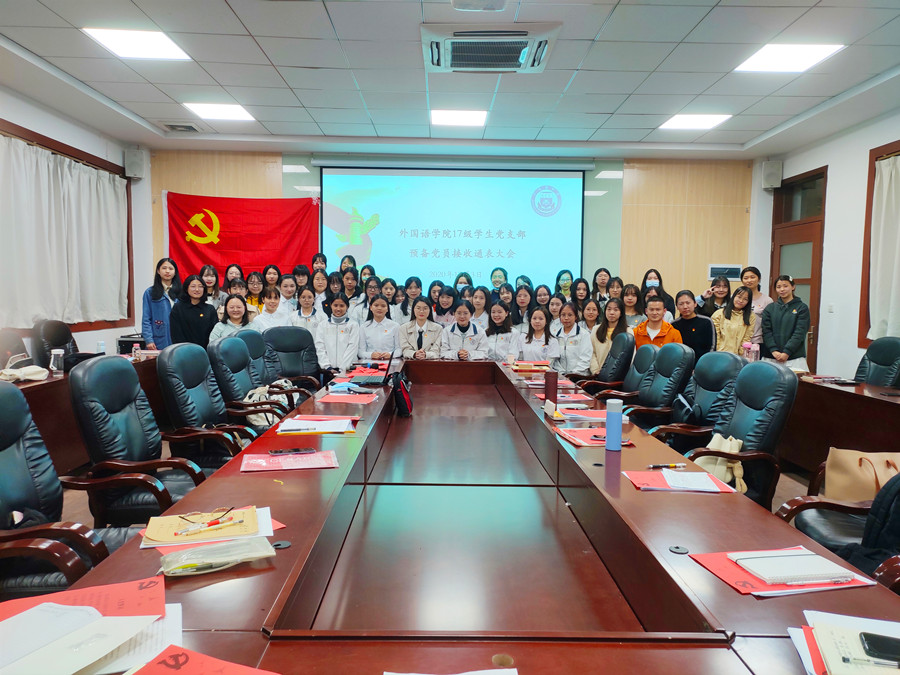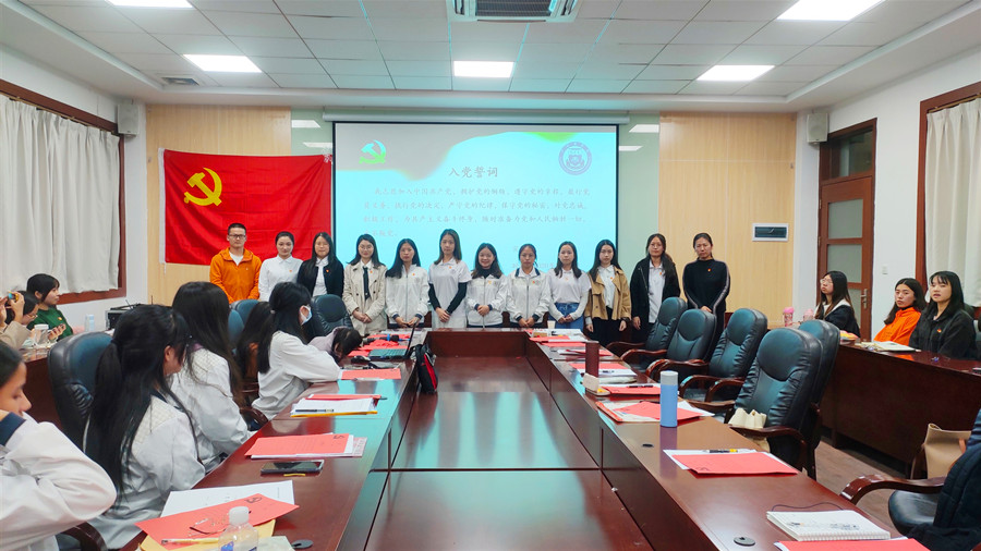 会议伊始,党支部书记黄士库向大家介绍接收预备党员通表大会的议程,会议主要分为两个部分,第一部分是发展对象转预备党员的汇报、表决,第二部分是预备党员的入党宣誓教育。紧接着,20位重点发展对象依次进行三分钟的自我陈述,从思想、学习、工作、生活等方面汇报自己的情况,真挚地表达了入党的决心和态度。每一位发展对象都准备了详细的汇报,她们声音洪亮,落落大方,充分展示了一名中共党员应该有的自信和气魄。在每一个发展对象完成汇报后,第一入党介绍人党支部书记黄士库、第二介绍人党支部副书记刘丽以及与会党员同志都对是否同意其发展为预备党员叙述意见。随后,每一位重点发展对象对会议讨论情况表明态度。经过无记名投票,20名重点发展对象顺利成为中共预备党员并加入17级学生党支部大家庭,大家都为他们献上的热烈的掌声,党支部书记黄士库为她们佩戴党员徽章,并带领大家宣读入党誓词。最后,由支部书记黄士库总结此次会议,本次大会在合影留念中顺利结束。