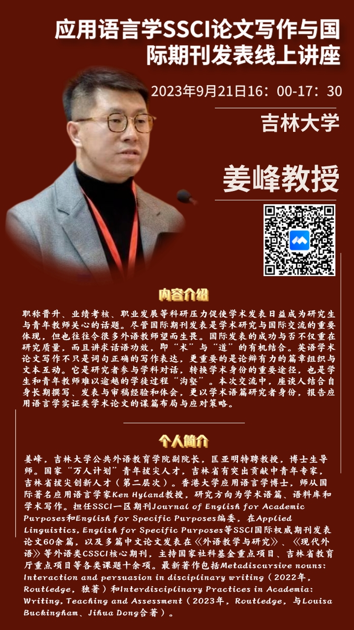 姜峰指出,国际期刊的发表是学者与全球学术界沟通交流的重要途径,是一个展示学术研究成果的优秀平台,但许多外语教师因其严格的要求和复杂的提交过程而感到畏惧。他认为,成功发表不仅依赖于研究的质量和深度,更重要的是学者如何将“术”与“道”融为一体,展现出卓越的话语功效。通过学术写作,研究者能够更加深入地参与到学科对话中来,这是他们转换学术身份、提升学术地位的重要手段。对于学生和青年教师而言,学术写作更是一项必须经历并且不断精进的基础学科技能。