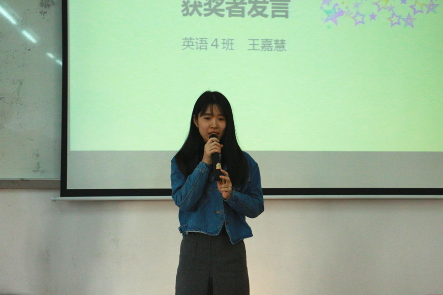 活动伊始,袁鑫为活动致辞,他总结了2016级商务英语专业和英语专业学生在本次大赛的参赛情况,也肯定了比赛的成绩。自今年9月26日至10月26日举办以来,本次比赛得到了学院2016级师生们的关注与支持,参与人数达600多人,形成了广泛的影响力。大会为在本次比赛中获得优异成绩的2016级英语4班王嘉慧等12名同学颁奖。王嘉慧同学作为一等奖获得者为同学们分享了参赛心得,她提出在英语口语锻炼中“勤能补拙”的学习态度,她认为“勇于挑战”是不断提高自己的秘笈。