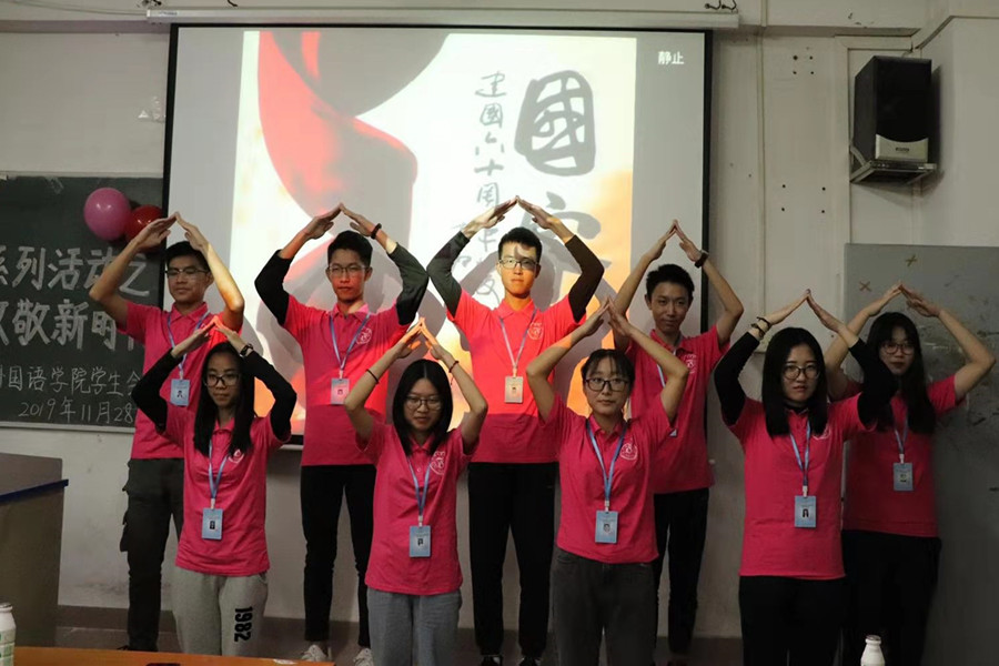 现场播放了万象城今年暑期社会实践过程中所拍摄的方言版《我向祖国妈妈表白》等视频,唤起了同学们的爱国热情与民族自豪感。在“祖国名胜我知晓”问答环节中,同学们看着一张张照片描绘着祖国的大好河山,踊跃抢答。学习部与网络部“小粉人们”以手语操《国家》为新中国成立70周年献礼,将现场气氛推向高潮。