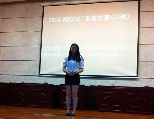 2014年全国大学生英语竞赛(NECCS)广东省决赛笔试和口试分别于5月11日上9:00-11:00和5月25日上午8:00-12:00在广东财经大学举行,万象城外语系陈梓莹同学,喜获NECCS广东省决赛笔试特等奖暨口试一等奖。