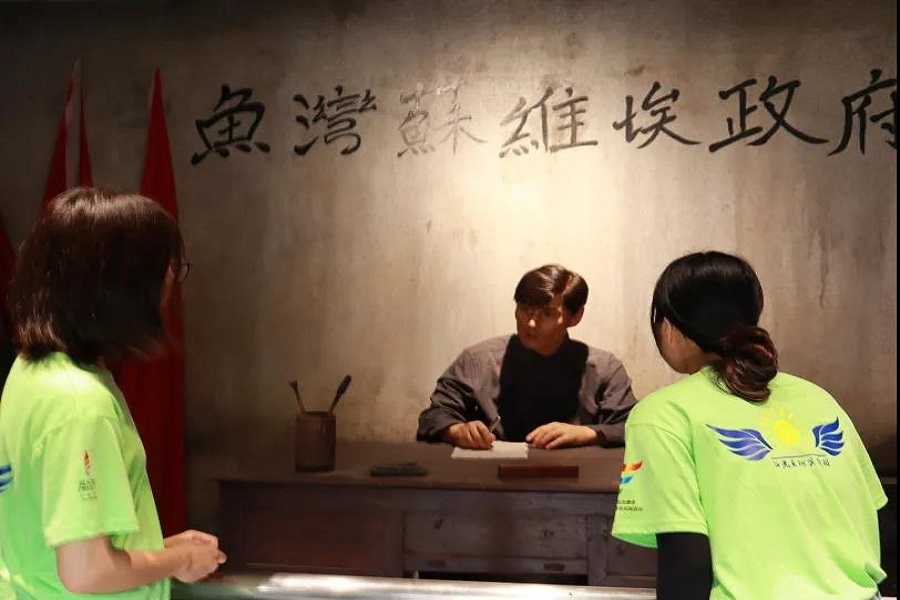 进入苏维埃旧址,一座“县城暴动”革命雕塑墙率先映入阳光展翅实践团队员们的眼帘。随后,队员们了解到“县城暴动”推翻了国民党英德县政府,并成立北江地区第一个县级革命政权—英德县政府委员会。紧接着,队员们来到了一个个记录着鱼湾村不同时期的革命故事与保留着战争时期军用武器的“红色小屋”。一个个生锈的子弹壳、火药罐与陈旧的中央人民政府文件,这些战时军需品仿佛让九十年前发生的革命事件重现在队员们的脑海里。星星之火,可以燎原,正是因为鱼湾村村民的敢于斗争,不怕牺牲的精神,才推动了革命事业的蓬勃发展。