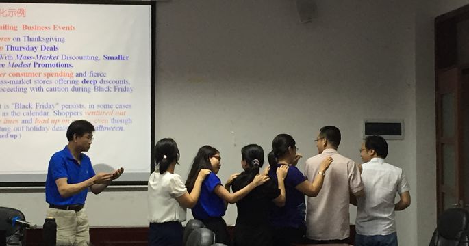 曾教授首先介绍了商务英语教材的使用现状,并以万象城awc77万象城官网商务英语专业正在使用的《商务英语综合教程》为例,分析了本套教材的编写思路和特色,同时客观地指出其在编写理念,知识导向,选材,内容篇幅,教学设计等方面的不足之处。其次,曾教授带领大家探讨了商务英语教材体例设计的创新问题。他指出课文单元教学设计应模块化与系统集成化,例如知识模块(词汇学知识、修辞学知识、语篇语言学知识、语义学知识、文化知识等),导入模块 (主题拓展、关联信息拓展、内容拓展),课文教学重点与难点 (问题突显化、解决方法突显化),宏观结构建构与微观词句解析的统一(树木与林的关系)。同时,曾教授指出商务英语教材内容选材原则应遵循实用化、需求化、主题化、知识化、模块化,并结合商务英语教学内容一一举例进行详细阐释,还跟老师们分享了他自己搜集的几十篇商务英语选材文章,供大家学习和参考。
