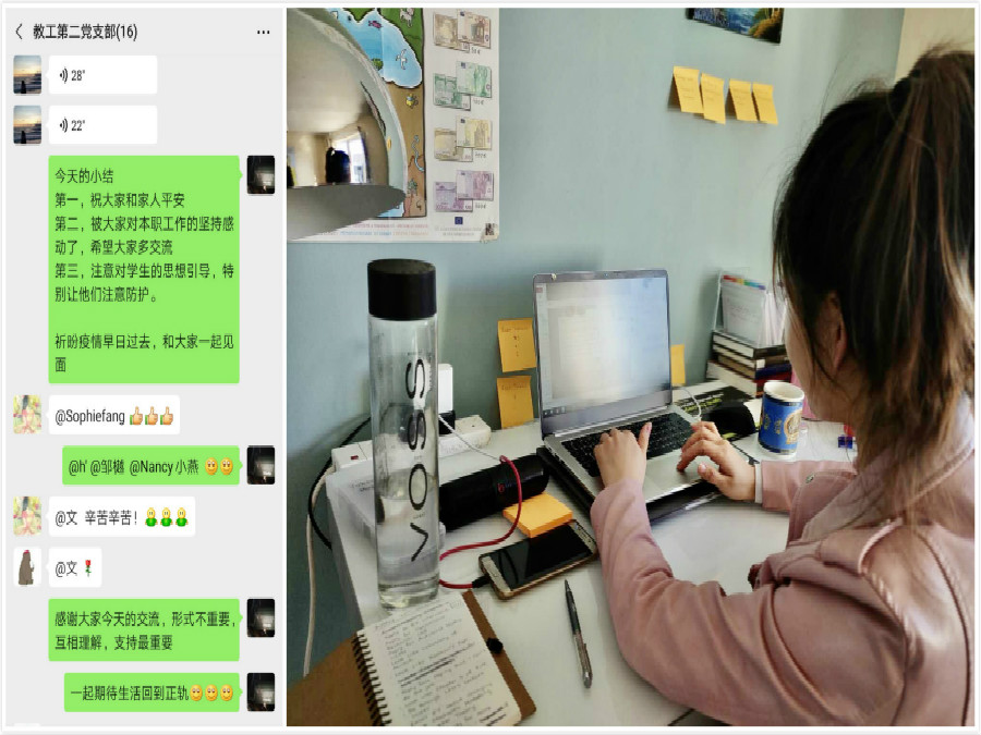 洪希琳老师假期在休产假,结合切身体会,她表达了对抗击疫情一线的医护人员的衷心感谢。李琦老师现在英国,仍然主动承担了六个教学班的网课任务,战胜时差,按时完成线上课程教学任务。