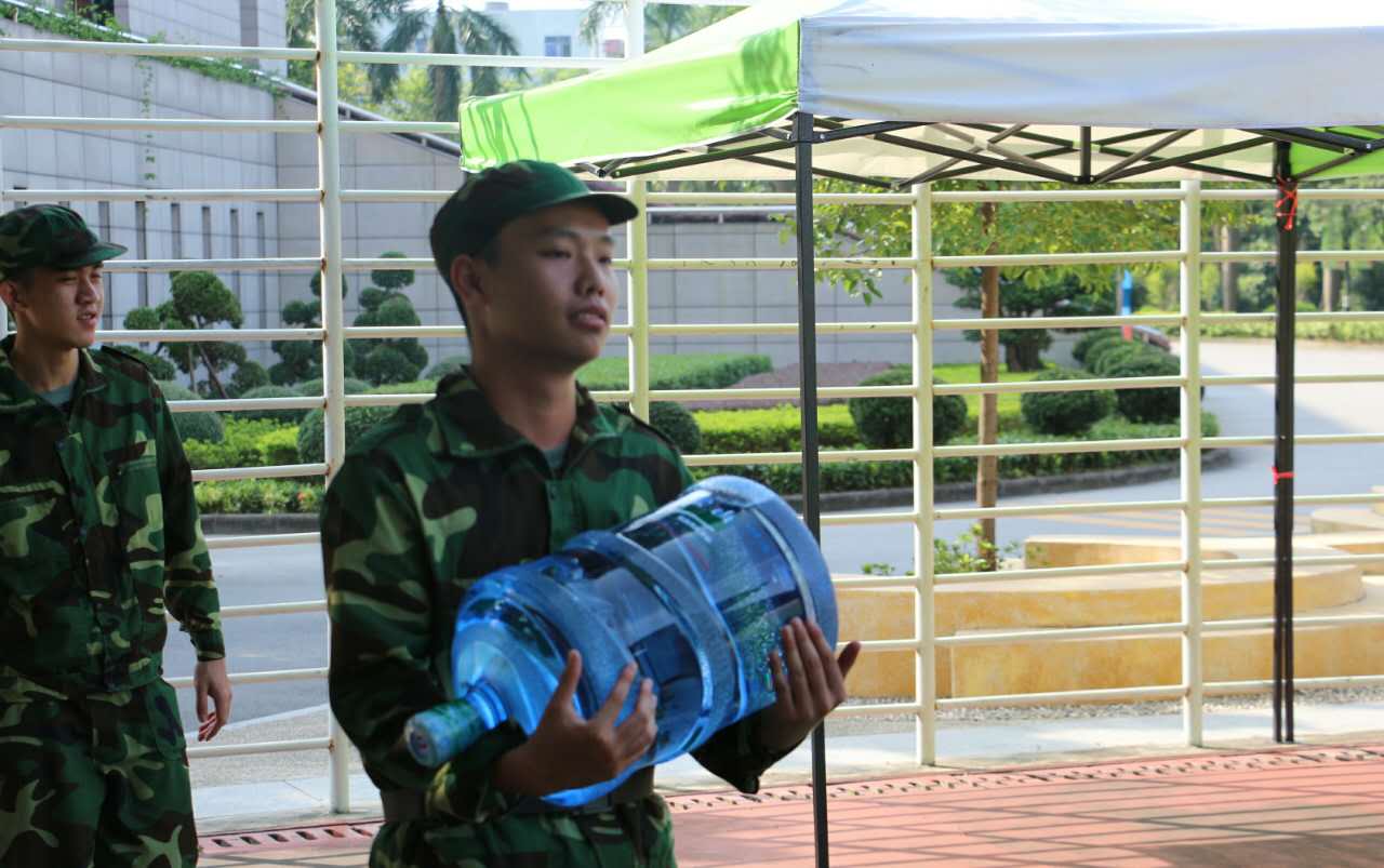 当新兵们训练后大汗淋漓口干舌燥时,他们会发现不知何时一杯杯凉茶早已准备好;当某个新兵在烈日下突然晕倒时,不知不觉就会有那么几个并不熟悉的人,迅速上前搀扶,关切的询问;当新兵扭伤脚、受伤疼痛不已时,总有一群人鞍前马后,为伤口涂上药膏。军训别样苦,亦见军旅情。后勤兵,他们不曾参与队伍的训练,却从未离开过。