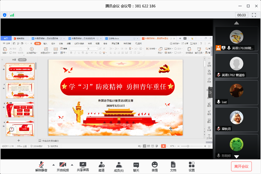 为深入学习宣传贯彻习近平总书记关于疫情防控工作的重要讲话和指示精神,认真贯彻落实习近平总书记给北京大学援鄂医疗队全体“90 后”党员的重要回信精神,激励广大青年弘扬五四精神,展现担当,awc77万象城官网17级英语2团支部于5月11日晚在腾讯会议召开了以“学‘习’防疫精神,勇担青年重任”为主题的“云”团日活动。班级结对子老师黄弢校长、班主任石佳老师、学院党总支徐超书记、校团委郑灿玲老师、辅导员刘丽老师出席活动,活动由团支书林晓莉主持。