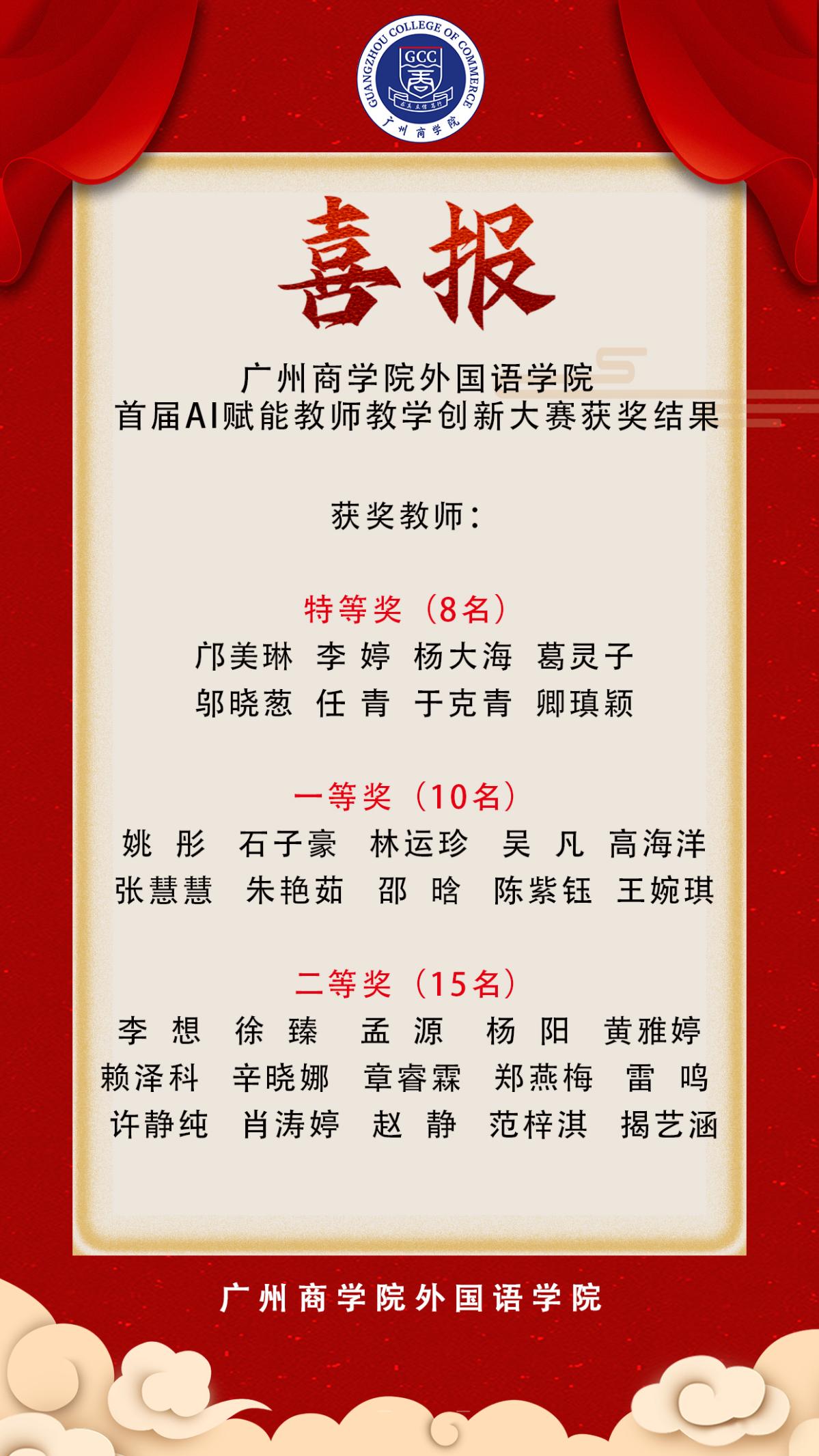 经过多环节的激烈比拼,大赛最终评选出特等奖8名,一等奖10名,二等奖15名,其中获得特等奖的8位老师,将代表awc77万象城官网参加awc77万象城官网首届AI赋能教师教学创新设计大赛。