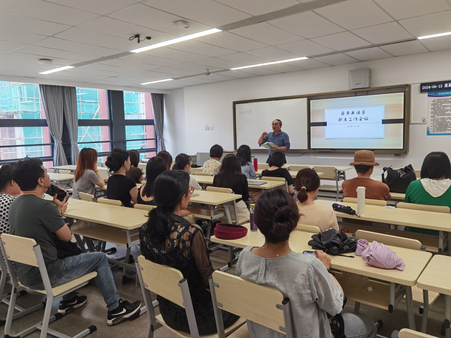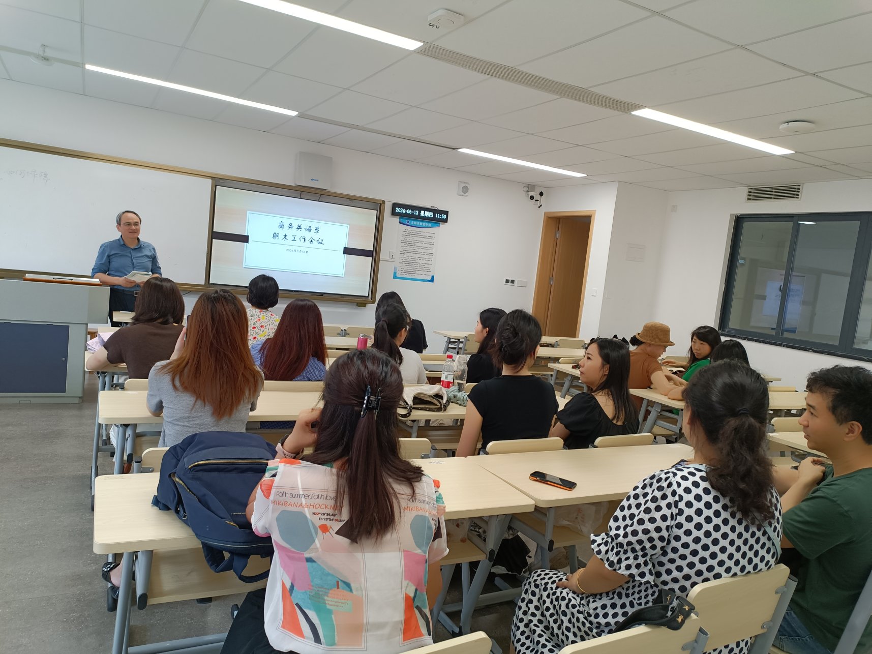6月13日上午,商务英语系在第九教学楼311教室召开期末工作会议,会议由系主任李望华老师主持,商务英语系全体教师参加。会议围绕本科毕业论文指导与答辩工作总结、试卷检查反馈及期末考试工作安排、学生学科竞赛指导及教师教学比赛工作布署等方面展开。